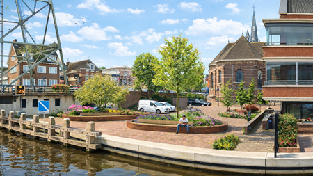 De gemeente start in april met de vergroening op het Kerkplein in Boskoop. Hier komt een ontmoetingsplek met groenvakken met zitplekken aan het water.