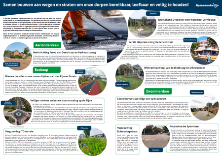 In de hele gemeente Alphen aan den Rijn zijn we hard aan het werk om verschillende wegen en straten op te knappen. Dat allemaal met het doel om onze dorpen bereikbaar, leefbaar en veilig te houden. In een aantal specials vertellen we u wat er allemaal gebeurt in de verschillende dorpen. In deze special leest u meer over de projecten die de afgelopen periode zijn uitgevoerd in Aarlanderveen, Boskoop en Zwammerdam.